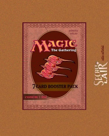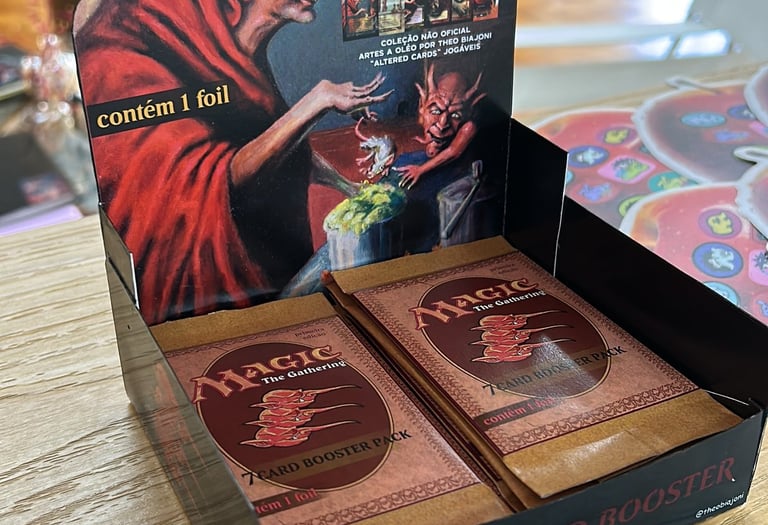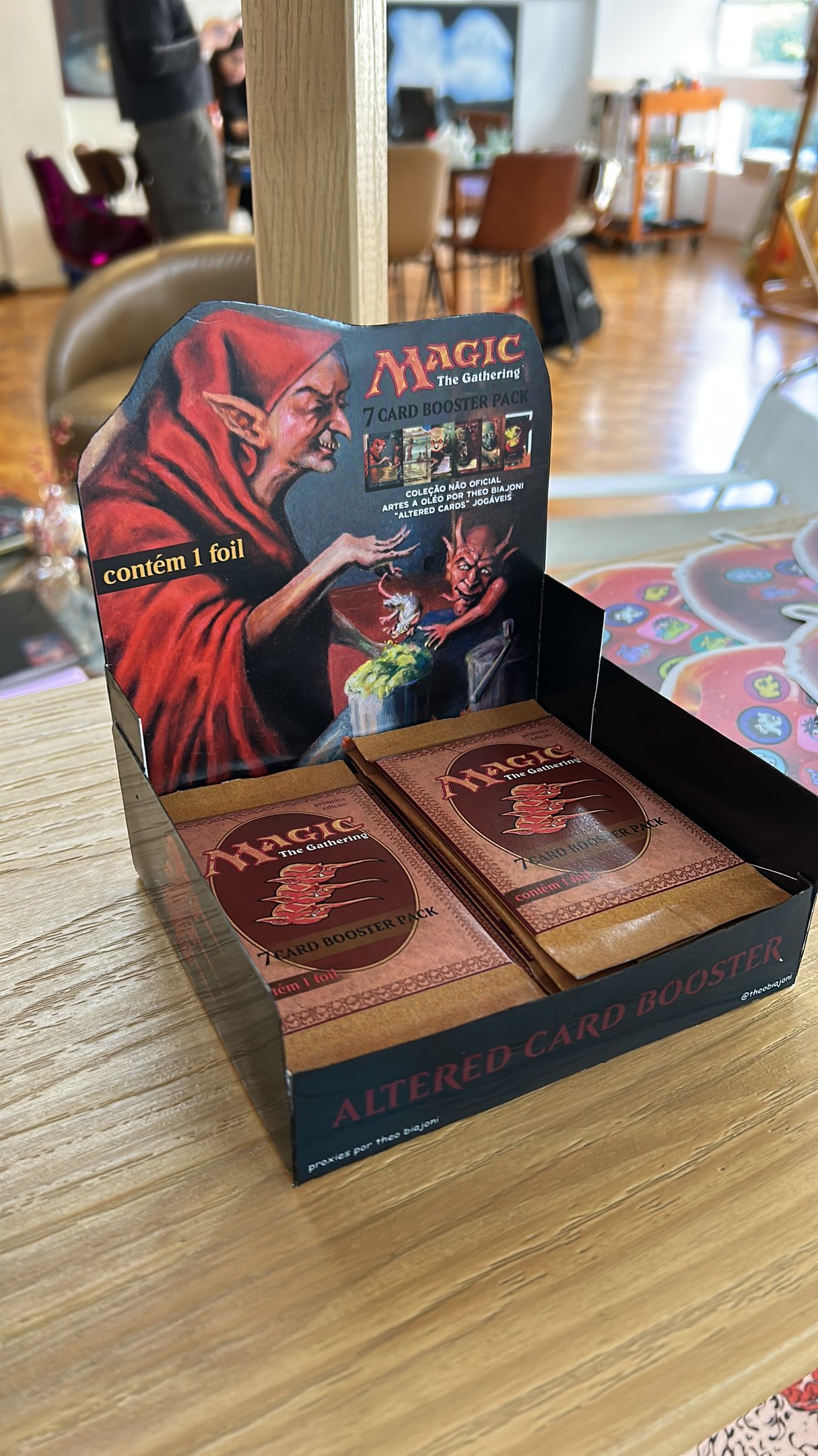 Cada booster contém as 7 cartas, uma holográfica aleatória. As cartas surgem de pinturas a óleo que fiz ao longo dos ultimos anos, editei e diagramei elas em cartas de Magic ja existentes, são Proxies feitas com muito carinho, pra um jogo que eu amo.